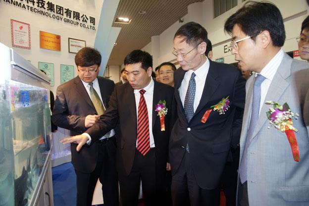 陳慶堂(左二)向農(nóng)業(yè)部高鴻賓副部長介紹水產(chǎn)品及天馬的相關(guān)配合飼料